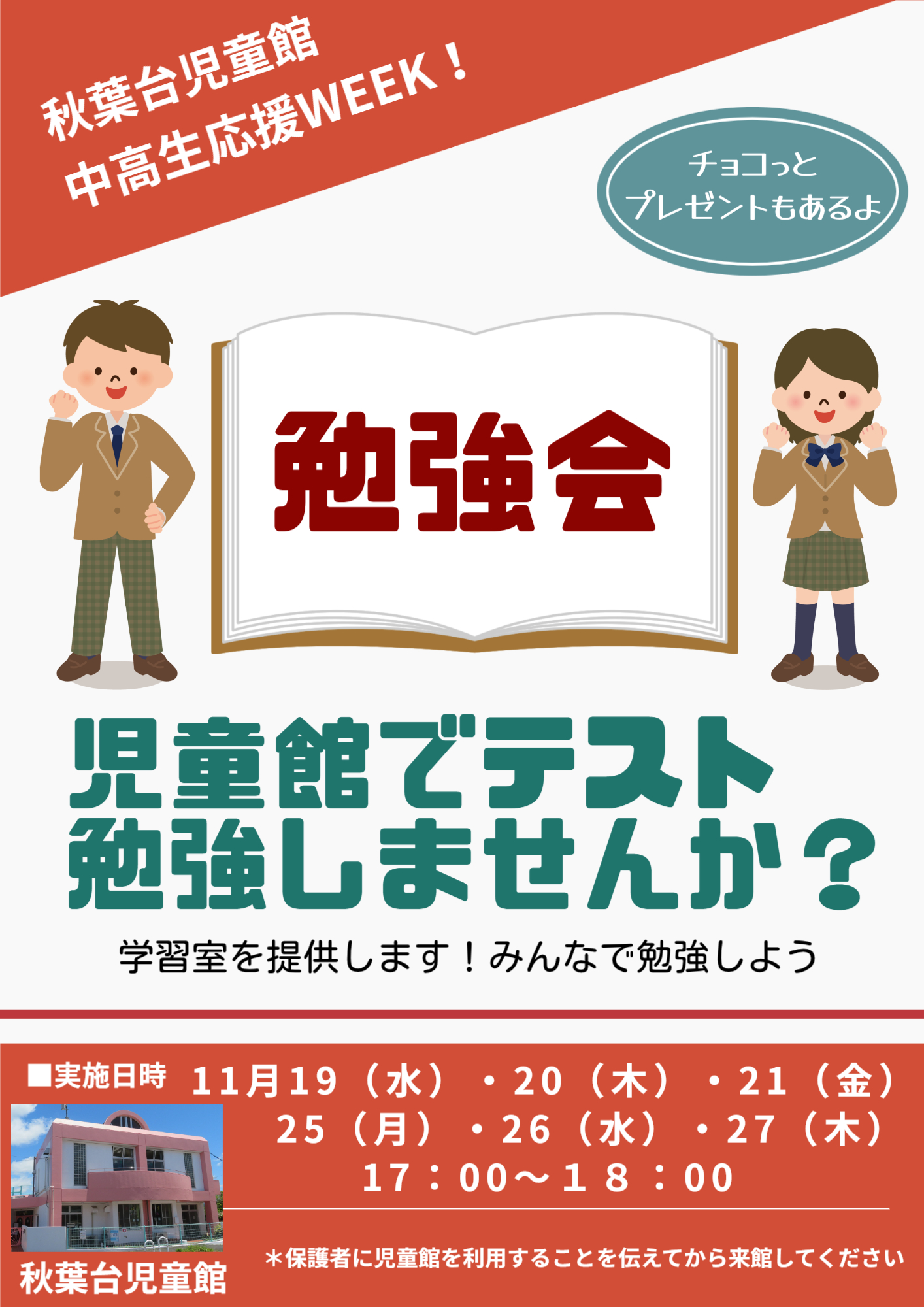 児童館でテスト勉強をしませんか?学習できるお部屋を提供します。児童館はがんばるみんなを応援します!